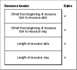 As Figure 1-11 shows, every resource fork begins with a resource header. Because the resource header contains an offset to the resource map, the resource map does not necessarily have to be located at the end of the resource fork.