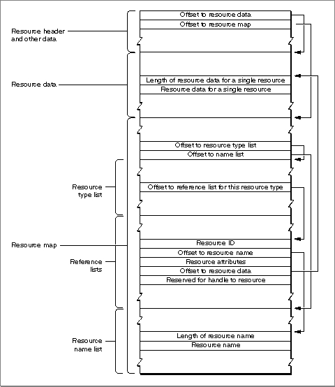 Figure 1-18 illustrates the use of various offsets in the resource header and resource map, including the offsets for an entry in a reference list for an individual resource. Although the figure shows the resource map after the resource data, the resource map can be located almost anywhere in the resource fork as long as the offset to the map in the resource header points to the right location.