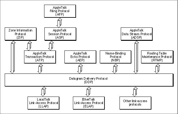 standing the functions that each protocol provides will help you determine which application programming interfaces to use for your application.The AppleTalk system architecture consists of a number of protocols arranged in layers. The various AppleTalk protocols are sets of rules, not computer programs, and so can be implemented in many different ways on many different systems. All of the AppleTalk protocol functions that you can address or control from a Macintosh application are implemented as Macintosh device drivers or managers. Many other features of these protocols are implemented in software located only on internet routers that are not used to run general applications. Some parts of protocols are implemented by server software such as file servers or print servers.