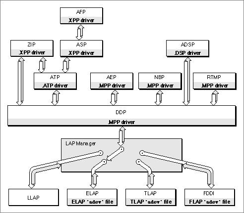 Above the data-link level, all of the AppleTalk protocols that you can address or control from a Macintosh application through a programming interface as well as multinode architecture are implemented as Macintosh device drivers. Table 1-2 identifies the AppleTalk drivers and the protocols they implement.Figure 1-3 shows the AppleTalk protocols with the name of the driver that implements the protocol and the connection files of type