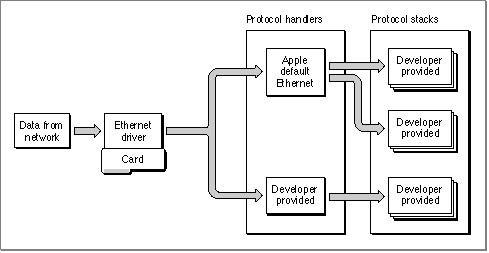You can write an application that processes packets for a protocol other than AppleTalk and run your application on Macintosh computers that also run the AppleTalk protocol stack. To send data from your application, you need to communicate directly with a network hardware device driver. To read data, you either use the LAP Manager or directly communicate with the hardware device driver, depending on the type of packet that your application processes. To read data from the network hardware device driver, you must use a protocol handler, which is code that the driver calls, in this case, to process an incoming packet for a specific protocol type.Ethernet Phase 1 packets are IEEE 802.3 protocol packets. If your application processes Ethernet Phase 1 packets, you can use the default protocol handler that Apple Computer, Inc. provides to read data addressed to the protocol type that your application handles, or you can create and attach your own protocol handler to read that data. The chapter "Link-Access Protocol (LAP) Manager" in this book provides more information about Phase 1 and Phase 2 packets, including figures that show the two packet formats.