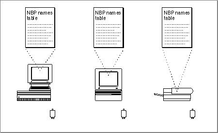 Figure 3-2 The NBP names table on each node, collectively forming an NBP names directory
