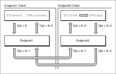 OTConnectfunction, it specifies some value X for an option. The endpoint provider, Endpoint1, lowers this value before passing it to the remote endpoint, Endpoint2. The remote endpoint lowers the value further before notifying its client of the incoming connection. When theOTListenfunction returns, it specifies the option value X-2. The remote client decides to accept the connection using theOTAcceptfunction but also to lower it further to X-3. When the client that initiated the connection receives the remote client's response via theOTRcvConnectfunction, it can examine the option values to determine the final negotiated value for the option it requested. (By way of example, Figure D-1 shows that the negotiated value is lowered at each stage of the negotiation. Depending on the option being negotiated, however, a higher value could result from the degradation resulting from a negotiation.)Figure D-1 Negotiating an association-related option