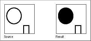 TheCalcMaskprocedure produces a bit image with 1's in all pixels to which paint could not flow from any of the outer edges of the rectangle. You can use this bit image as a mask with theCopyBitsorCopyMaskprocedure. As illustrated in Figure 3-26, a hollow object produces a solid mask, but an open object produces a mask of itself.Figure 3-26 A source image and the resulting mask produced by the