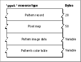 PixMaprecord (described on page 4-37), except that the resource contains an offset (rather than a handle) to a color table (which is included in the resource).- Pattern image data. The size of the image data is calculated by subtracting the offset to the image data from the offset to the color table data.