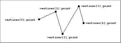 A polyline is a collection of n lines defined by the n+1 points that define the endpoints of each line segment. The entire polyline can have a set of attributes, and each line segment in the polyline also can have a set of attributes. (In addition, each vertex can have a set of attributes.) A polyline is defined by the TQ3PolyLineData data type. See "Creating and Editing Polylines," beginning on page 4-68 for a description of the routines you can use to create and edit polylines. Figure 4-11 shows a polyline.