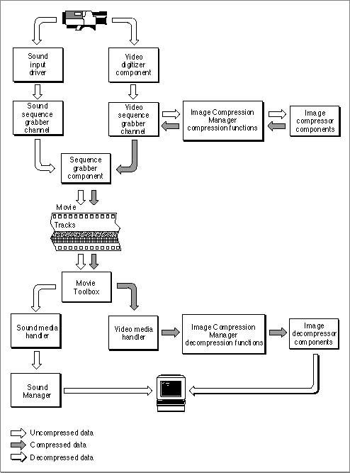 the QuickTime architecture. For comprehensive information on the video digitizer component, the sequence grabber channel component, the sequence grabber component, and video and media handlers, see Inside Macintosh: QuickTime Components.Figure 1-4 Capturing and playing back movies