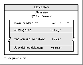 'moov'. It contains other types of atoms, including one leaf atom--the movie header ('mvhd')--and several atoms that contain other atoms: a clipping atom ('clip'), one or more track atoms ('trak'), and user-defined data ('udta').Figure 4-5 shows the layout of a movie atom. The movie header atom is the only required atom in the movie atom.