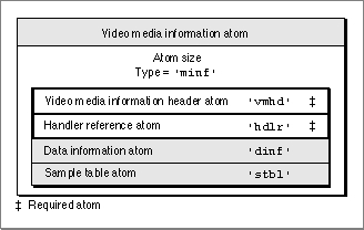 Video media information atoms are the highest-level atoms in video media. A number of other atoms define specific characteristics of the video media data. Figure 4-17 shows the layout of a video media information atom.Figure 4-17 The layout of a media information atom for video
