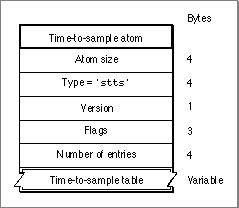 Time-to-sample atoms store duration information for the samples in a media, providing a mapping from a time in a media to the corresponding data sample. The time-to-sample atom has an atom type of'stts'.You can determine the appropriate sample for any given time in a media by examining the time-to-sample atom (shown in Figure 4-25), which contains the time-to-sample atom table.
