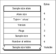 - Sample size table. The sample size table, which contains the sample size information. A sample size table contains an entry for every sample. Each table entry contains a size field. There is one table entry for each sample in the media. The table is indexed by sample number--the first entry corresponds to the first sample, the second entry is for the second sample, and so on. The size field contains the size, in bytes, of the sample in question.