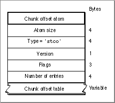 'stco'. The chunk offset atom (shown in Figure 4-35) contains a table of offset information.Figure 4-35 The layout of a chunk offset atom