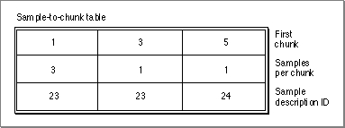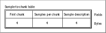 - Sample-to-chunk table. Figure 4-31 shows the structure of a sample-to-chunk table. Each sample-to-chunk atom contains such a table, which identifies the chunk for each sample in a media. Each entry in the table contains a first chunk field, a samples per chunk field, and a sample description ID field. From this information, you can ascertain where samples reside in the media data.