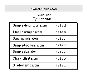 'stbl'. It contains the sample description atom, the time-to-sample atom, the sample-to-chunk atom, the sync sample atom, the sample size atom, the chunk offset atom, and the shadow sync atom.Figure 4-23 shows the layout of the sample table atom.