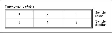 Figure 4-27 shows an example of a time-to-sample table that is based on the data stream shown in Figure 4-22 on page 4-22. Figure 4-22 shows a total of nine samples that correspond in count and duration to the entries of the table shown in Figure 4-27. Even though samples 4, 5, and 6 are in the same chunk, sample 4 has a duration of 3, and samples 5 and 6 have a duration of 2.