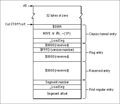 The Jump Table Figure 9-2 shows the structure of a CFM-68K runtime jump table. This jump table is similar to the classic 68K far model jump table as shown in Figure 10-10 (page 10-23). Figure 9-2 CFM-68K runtime jump table structure