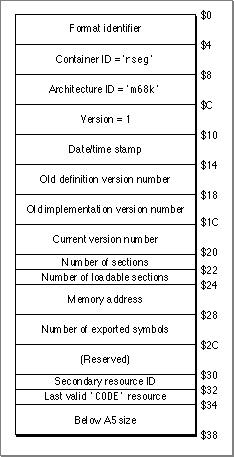 The'rseg'0resource is the resource loaded and retained by the Code Fragment Manager and is the fragment referenced from the'cfrg'0resource. Since the Code Fragment Manager does not release an "active" fragment, the'rseg'0resource does not contain the executable fragment, but only a small data structure. This structure specifies the location of the actual executable fragment as well as some additional information about the fragment. The actual executable fragment is stored in the'rseg'1resource, which can be released after the application launch procedures are completed. The'rseg'0resource contains a copy of the PEF container header from the'rseg'1resource along with other information, as shown in Figure 9-5. For more information about PEF headers, see "The Container Header," beginning on page 8-4.Figure 9-5 The