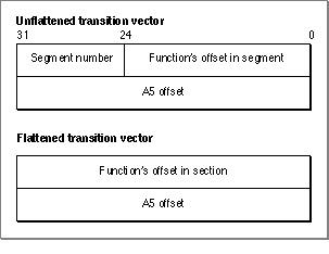 As with the jump table entries, MakeFlat converts the transition vector addressing scheme from one that is segment oriented to one that is code section oriented. MakeFlat generates a relocation instruction for each transition vector that adds the section's address and A5 address to the offset in each transition vector. Figure 9-7 shows a transition vector before and after conversion (flattening).Figure 9-7 A transition vector before and after flattening