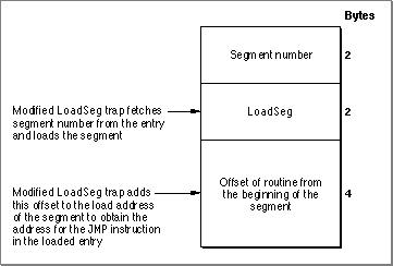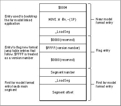 Figure 10-8 shows the unloaded jump table entry for a routine in a segment that is linked using the far model. As you can see, the modified entry omits the instruction that puts the segment number on the stack. The 2 bytes saved are then used to store the larger 4-byte offset that locates the routine within the segment. The Segment Manager gets the segment number from the entry itself and loads that segment.