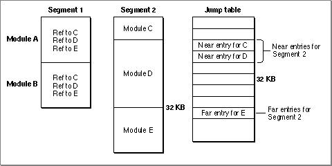 -model nearwithin the first 32 KB and code with-model farbeyond the 32 KB limit.When the jump table is built, the linker places near-referenced entries within the first 32 KB; far-referenced entries are placed after all near references. Thus near and far references for the same segment can be stored in different areas of the jump table. In Figure 10-9, the entry for