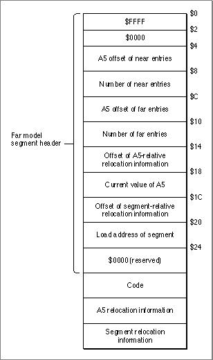 Address Entry $0 This field determines whether the segment has been built according to the far model option. Namely, the first word of the segment header must match the version field in the jump-table flag entry, $FFFF. $2 Reserved. $4 The byte offset from A5 of the first near model jump table entry. $8 The number of near entries. $C The byte offset from A5 of the first far model jump table entry. $10 The number of far model entries. $14 The offset (from the beginning of the segment) of the relocation information for A5-relative references. A5-relocation information contains the addresses of all instructions in a segment that references far model global data or far model jump table entries. $18 The current A5 value, which is added to the offset specified in the A5-relative address field of the instruction to calculate the actual address. $1C The offset, from the beginning of the segment, of the relocation information for PC-relative references. $20 The segment load address, which is added to the offset specified in the A5-relative address field of the instruction to calculate the actual address of the entry point. $24 Reserved.