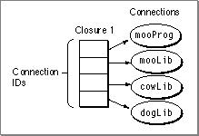The Code Fragment Manager does not create new connections when sharing a fragment within a process but uses the ones that are currently available. Therefore it is possible for separate closures in the same process to refer to a fragment by the same connection ID. Connections are not shared across processes, however, so new connections (and connection IDs) are created when a fragment appears in another process.