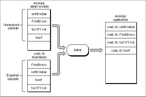 Checking compatibility between a client fragment and an import library essentially means checking for an intersection between the version range required by the client fragment and the range supported by the import library.When building a fragment that requires an import library, you must supply information in a definition stub library that defines the library's API. A stub library contains symbol definitions but does not contain actual code. The linker uses definition stub libraries to associate imported symbols with particular import libraries. Figure 1-8 shows an application linking to a definition stub library to produce the completed application. A reference such as