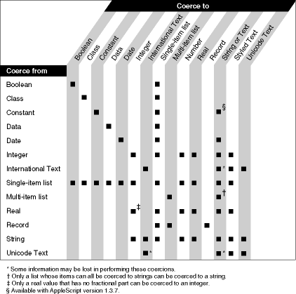 Figure A-1 summarizes the coercions that AppleScript supports for commonly-used value classes. To use the figure, find the class of the value to be coerced in the column at the left. Search across the table to the column labeled with the class to which you want to coerce the value. If there is a square at the intersection, then AppleScript supports the coercion.