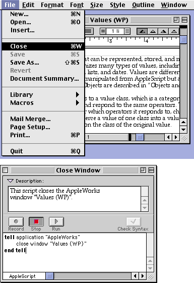 AppleScript is a scripting language that allows you to control Macintosh computers without using the keyboard or mouse. With AppleScript, you can use a series of English-like instructions, known as a script, to control applications, the Finder (or desktop), and many parts of the operating system. For example, Figure 2-1 shows the difference between closing an application window with the mouse and performing the same task with a script.
