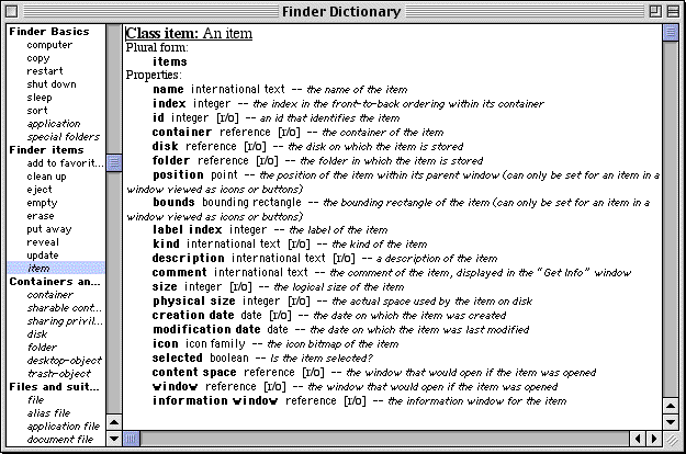Dictionaries tell you which objects are available in a particular application and which commands you can use to control them. You can view an application's dictionary by dropping the application's icon on the Script Editor's icon, or by opening the application with the Script Editor's Open Dictionary command. Figure 2-6 shows the Finder's dictionary, with the Item class displayed. For more information on using the Script Editor, refer to the AppleScript section of the Mac OS Help Center.