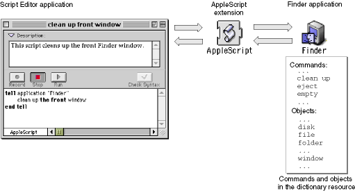 When you use a Tell statement or specify an application name completely in a statement, the AppleScript extension gets the dictionary resource for the application and reads its dictionary of commands, objects, and other words. Every scriptable application has a dictionary resource (of resource type 'aete' ) that defines the commands, objects, and other words script writers can use in scripts to control the application. Figure 2-7 shows how AppleScript gets the words in the Finder's dictionary.