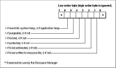 into memory only when needed; whether the resource should be read into the application or system heap; and whether the resource is purgeable.The resource attributes for a resource are described by bits in the low-order byte of an integer value. Figure 1-3 shows which bits correspond to each resource attribute.