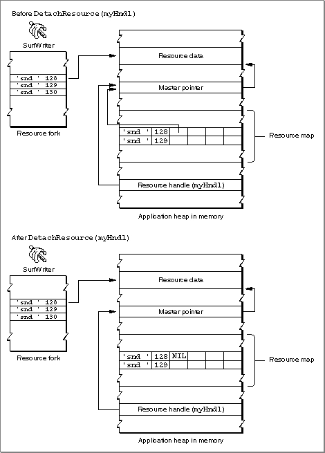 GetResource. The figure also shows how the Resource Manager replaces the handle in the resource map in memory with a handle whose value isNILwhen your application callsDetachResource.Figure 1-9 Detaching a resource