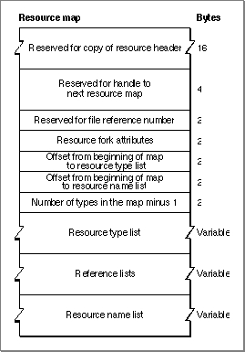 The resource data in a resource fork is followed by the resource map. Figure 1-14 shows the format of a resource map.