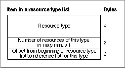 Each item in a resource type list specifies one resource type used in the resource fork, the number of resources of that type, and the location of the reference list for that type. Figure 1-15 shows the format of an item in a resource type list.