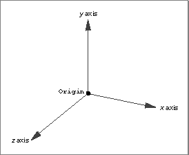 in space is determined by projecting the point onto the coordinate axes, which are mutually perpendicular lines that intersect at a point called the origin. By convention, the origin is the planar point (0, 0) or the spatial point (0, 0, 0). Figure 7-2 shows a Cartesian coordinate system that is right-handed (that is, if the thumb of the right hand points in the direction of the positive x axis and the index finger points in the direction of the positive y axis, then the middle finger points in the direction of the positive z axis).Figure 7-2 A right-handed Cartesian coordinate system