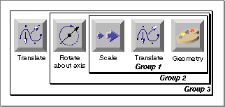 For example, consider the very simple model illustrated in Figure 7-1, which consists of three separate groups. A geometric object is first grouped with a scale and a translate transform (the translate transform was added to the group before the scale transform was added); the resulting group is then grouped with a rotate-about-axis transform, and that group is finally grouped with a second translate transform.