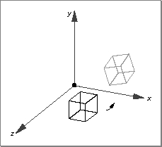 A rotate-about-axis transform rotates an object about an arbitrary axis in space by a specified number of radians at an arbitrary point in space. To specify a rotate-about-axis transform, you fill in the fields of a rotate-about-axis transform data structure, which specifies the axis of rotation, the point of rotation, and the number of radians to rotate. Figure 7-10 shows a unit cube before and after applying a rotate-about-axis transform.Figure 7-10 A rotate-about-axis transform