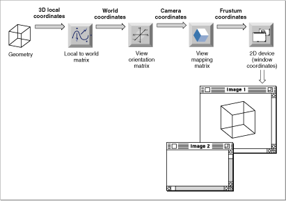 In addition to the local-to-world transform (which defines the relationship between an object's local coordinate system and the world coordinate system), QuickDraw 3D also maintains a world-to-frustum transform (which defines the relationship between the world coordinate system and the frustum coordinate system) and a frustum-to-window transform (which defines the relationship between a frustum coordinate system and a window coordinate system). See Figure 7-5. You can, if necessary, get a matrix representation of these three transforms. See the chapter "View Objects" for details.