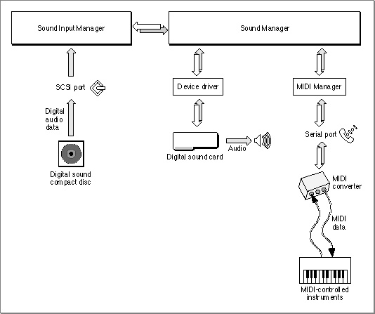 In general, you'll interact directly with the system software that provides these and other capabilities. The Macintosh sound architecture includes three principal system software services: