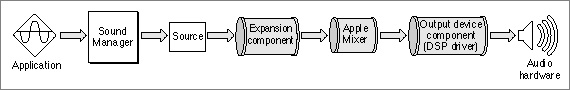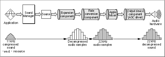 In general, an application that wants to produce a sound is unaware of the sound component chain required to produce that sound on the current sound output device. The Sound Manager keeps track of which sound output device the user has selected and constructs a component chain suitable for producing the desired quality of sound on that device. As a result, even though the capabilities of the available sound output hardware can vary greatly from one Macintosh computer to another, the Sound Manager ensures that a given chunk of audio data always sounds as good as possible on the available sound hardware. This means that you can use the same code to play sounds, regardless of the actual sound-producing hardware that is available on a particular machine.