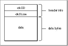 TYPE ChunkHeader = RECORD ckID: ID; {chunk type ID} ckSize: LongInt; {number of bytes of data} END;TheckIDfield specifies the chunk type. An ID is a 32-bit concatenation of any four printable ASCII characters in the range' '(space character, ASCII value $20) through'~'(ASCII value $7E). Spaces cannot precede printing characters, but trailing spaces are allowed. Control characters are not allowed. You can specify values for the four types of chunks described later by using these constants: