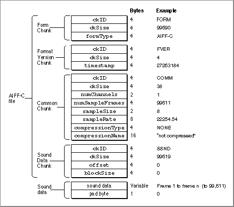 Figure 2-7 illustrates an AIFF-C file that contains approximately 4.476 seconds of 8-bit monophonic sound data sampled at 22 kHz. The sound data is not compressed. Note that the number of sample frames in this example is odd, forcing a pad byte to be inserted after the sound data. This pad byte is not reflected in theckSizefield of the Sound Data Chunk, which means that special processing is required to correctly determine the actual chunk size.On a Macintosh computer, the Form Chunk (and hence all the other chunks in an AIFF or AIFF-C file) is stored in the data fork of the file. The file type of an AIFF format file is